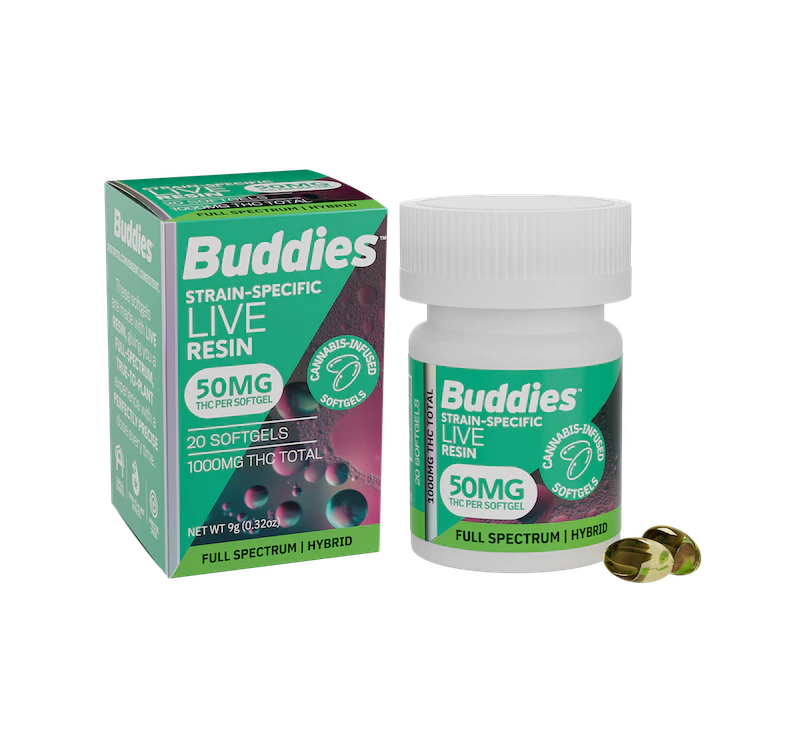 LIQUID LIVE RESIN SOFTGELS Experience Buddies’ high-quality Live Resin formula with maximum convenience with our pharmaceutical grade softgels. Available in bottle and trial sizes, each softgel captures a full spectrum of strain-specific cannabinoids and terpenes, providing a synergistic effect ideal to a well-rounded cannabis experience. Conceived to pair precise dosing with a discreet form, our softgels are perfect for any situation and ideal for those who prefer a method that’s familiar. Ingredients: Gelatin, Glycerine, MCT Oil, Cannabis Extract