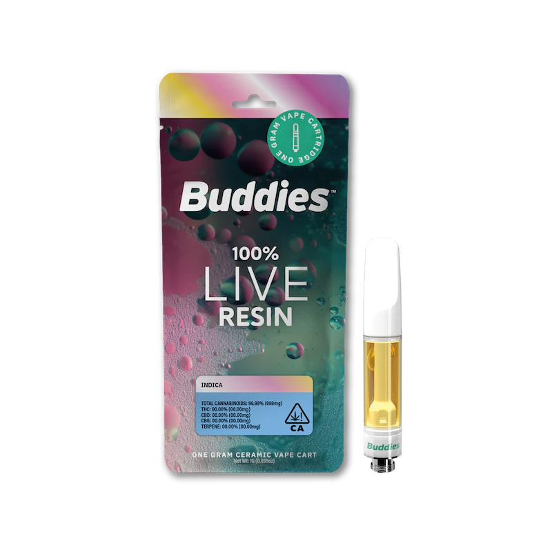 LIQUID LIVE RESIN 1G 510 VAPE CARTS Buddies 100% Liquid Live Resin begins with fresh frozen, whole-plant inputs and no distillate or cutting agents. Our liquifying process allows us to offer our pure Live Resin in a universal 510 thread ceramic vape cartridge for maximum versatility and fantastic flavors every time. Enjoy the same full spectrum experience of our Live Resin dabs while on the go! Zero Distillate | No Additives | No CRC Ingredients: 100% Live Resin