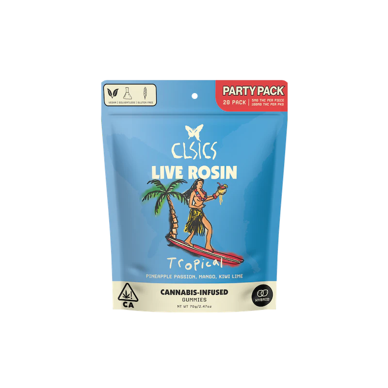 Dive into the tropics with our Tropical Party Pack of Live Rosin Hybrid Gummies - the ultimate fusion of premium live rosin extract and tropical bliss. Three mouthwatering flavors, Mango, Kiwi Lime, and Pineapple Passion will transport you to a paradise of flavor. The live rosin infusion guarantees a premium and potent experience, while the hybrid nature ensures a well-rounded and enjoyable high for both mind and body.