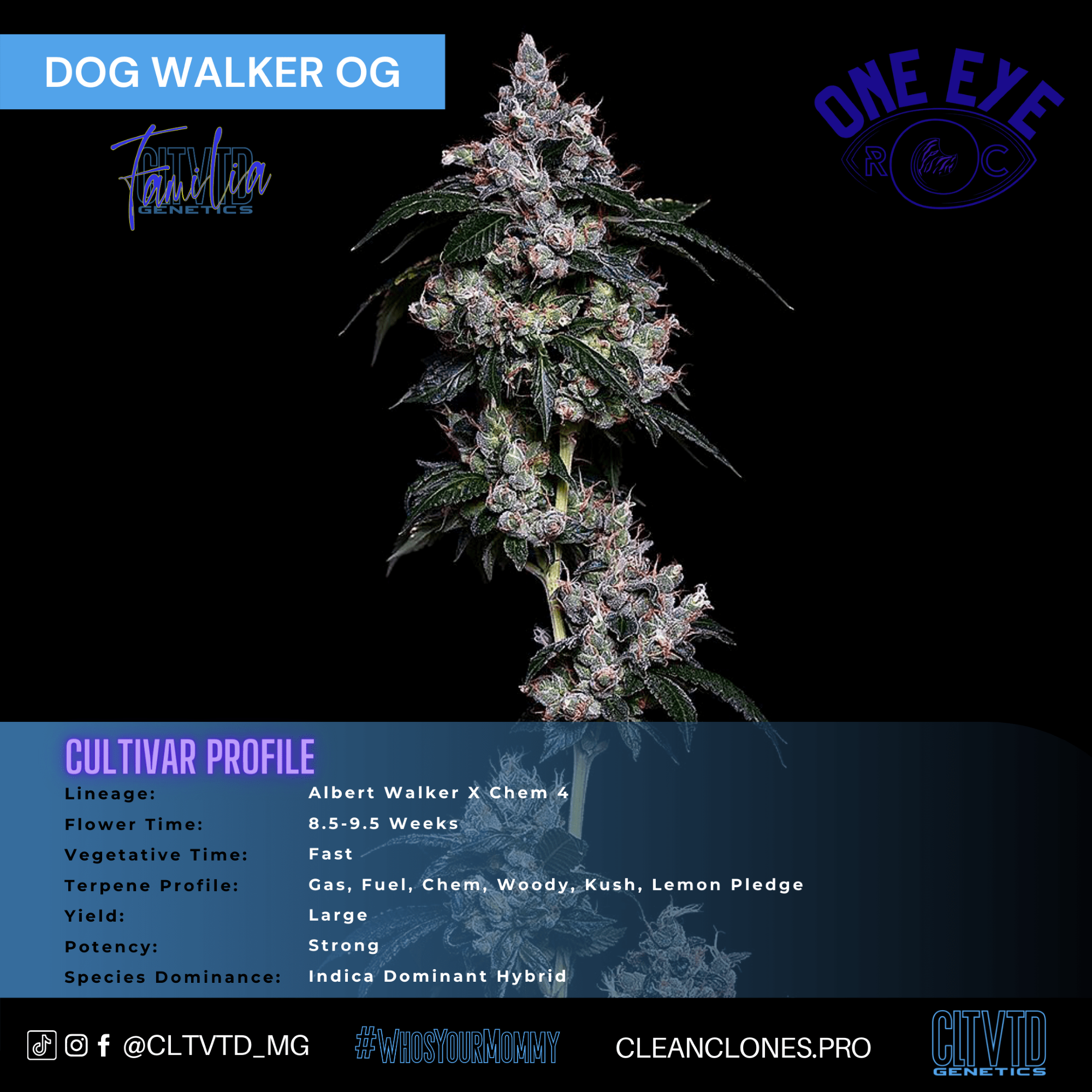SKU: 1002 Categories: Chem, Citrus, Fuel, gas, Hybrid, Indica Dominant, OG, Sativa Dominant Tags: Citrus (Limonene), DogWalker, DWK, OG, One Eye