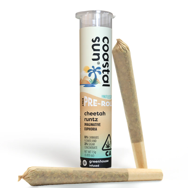 Cheetah Runtz is a mix of 80% Ridgelline Runtz flower and 20% Cheetah Piss sugar concentrate. The package includes two .75g pre-rolls, infused on the inside, with a sweet, gassy, and skunky flavor profile. It has been described as a euphoric experience that can potentially lead to relaxation, happiness, and a boost in creativity. Strain Combination: 80% Ridgeline Runtz Flower x 20% Cheetah Piss Concentrate Extracted By: Euphoric Life Type: Hybrid