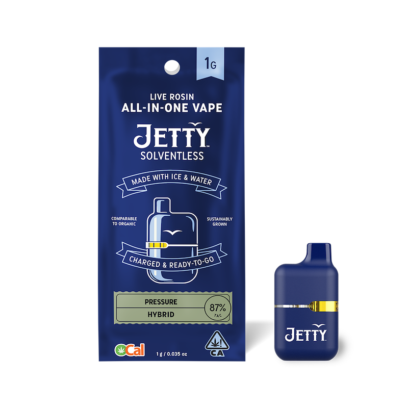 This Gary Payton x Rainbow Chip hybrid brings cinnamon-orange zest and a euphoric rush that clears your head and kicks back your body. Pressure lives up to its name—by relieving it. "Jetty Solventless is America's #1 live rosin. It is the cleanest oil available, made from OCal certified bud and extracted using only ice and water. Our unique filtration process removes excess fats and waxes increasing purity (and THC %) while keeping all the tasty terpenes. The result: a light, golden oil, and unmatched flavor profile. OCal is the comparable-to-organic program for cannabis grown and manufactured in California. OCal products are cultivated and extracted without pesticides, synthetic fertilizers, or bioengineering. Pure, potent, and portable, Jetty’s All-in-One Vape delivers everything you want in a vape. Award-winning rosin, 85%+ THC, and CCell's industry-leading vape technology. Featuring anti-clogging technology and a ceramic core for a smooth smoke from start to finish. "
