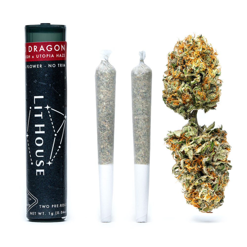 This exotic strain, bred in Amsterdam by Barney’s Farm, is a sativa-dominant cross of classic Afghani Kush with carefully selected and backcrossed Brazilian landrace. Red Dragon was brought to the Mendocino Coast sometime in the 2010s and has been a local favorite among coastal indoor growers ever since for its abundant yields, fierce potency, and spectacular flavor profile of juicy guava nectar and warm ginger. Fresh, shimmering green buds, adorned with flaming red stigmas, delight the nostrils with sweet tropical fruit, sultry spice, and savory parmesan. This soaring, inspiring sativa high will lift you to the clouds where the Kush genetics will leave you floating in total relaxation for hours. Enjoy a magical flight around the world on the wings of Red Dragon! Your favorite LitHouse cultivars in an easy to enjoy pre-roll. We think two is better than one, so each pack comes with two half-gram pre-rolls to give you the maximum amount of freshness and flavor with each and every puff. All of our pre-rolls come with the same high-quality cannabis we put in our jars. Our pre-rolls are 100% flower, no trim.