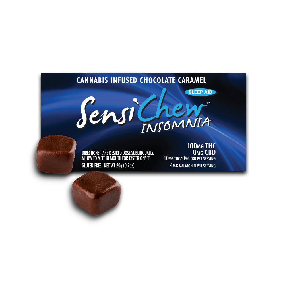 Sensi Chew - Insomnia - 90mg pk - For people who prefer a cannabis edible and want a restful night’s sleep and want the added sleep benefit of Melatonin to regulate sleep patterns. This cannabis-infused sleep aid helps reduce inflammation, headaches, and pain. Relaxes muscles and tension. Calms the mind and reduces stress. Addresses mild to severe insomnia depending on dosage and tolerance. Fall asleep fast and stay asleep all night. Wake up refreshed.