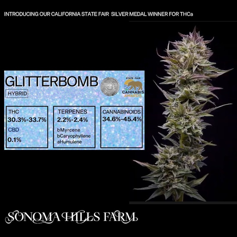 Premium craft cannabis grown in the California sunshine, available in 1/8th jars. Aka The Glitterbomb. A prettier bud will not be found. She shines back at you when you turn the lights on her, Compound Genetics new new hit is gonna hit you right where it feels good. Break this flower up and all eyes are on you, she is loud and heavy. Glitterbomb will not disappoint if you can get your hands on her. Compound genetics has a deep bench, but Glitterbomb is in the starting lineup this year. Sonoma Hills Farm is proudly OCal certified "comparable-to-organic" and Sun&Earth certified. Aromas of Grapes, Lemongrass, and Blueberries Effects of Full Body High, Introspective, Cerebral