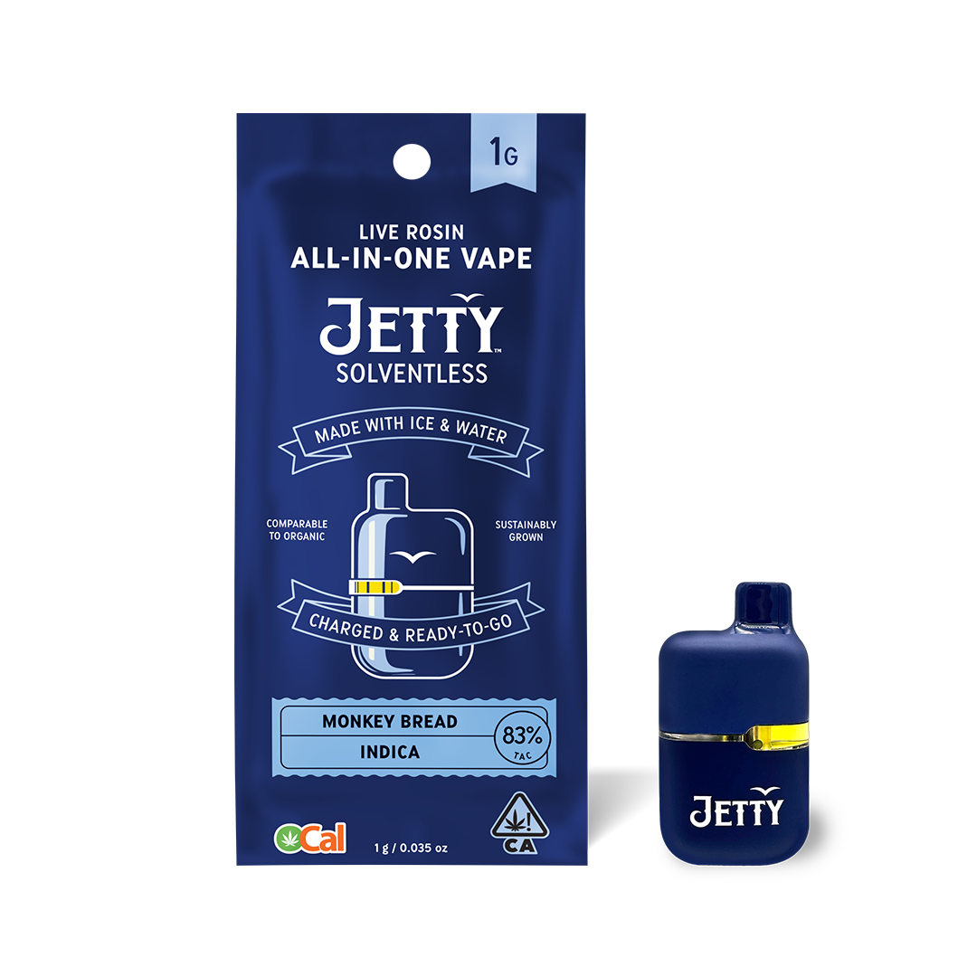 "Monkey Bread is the perfect treat to end your day—earthy, sweet, and spiced just right. Its mellow, sociable effects make it ideal for kicking back with good company or winding down solo with a smile. Jetty Solventless is America's #1 live rosin vape. It is the cleanest oil available, made from OCal certified bud and extracted using only ice and water. Our unique filtration process removes excess fats and waxes increasing purity (and THC %) while keeping all the tasty terpenes. The result: a light, golden oil, and unmatched flavor profile. OCal is the comparable-to-organic program for cannabis grown and manufactured in California. OCal products are cultivated and extracted without pesticides, synthetic fertilizers, or bioengineering. Pure, potent, and portable, Jetty’s All-in-One Vape delivers everything you want in a vape. Award-winning rosin, 85%+ THC, and CCell's industry-leading vape technology. Featuring anti-clogging technology and a ceramic core for a smooth smoke from start to finish. "