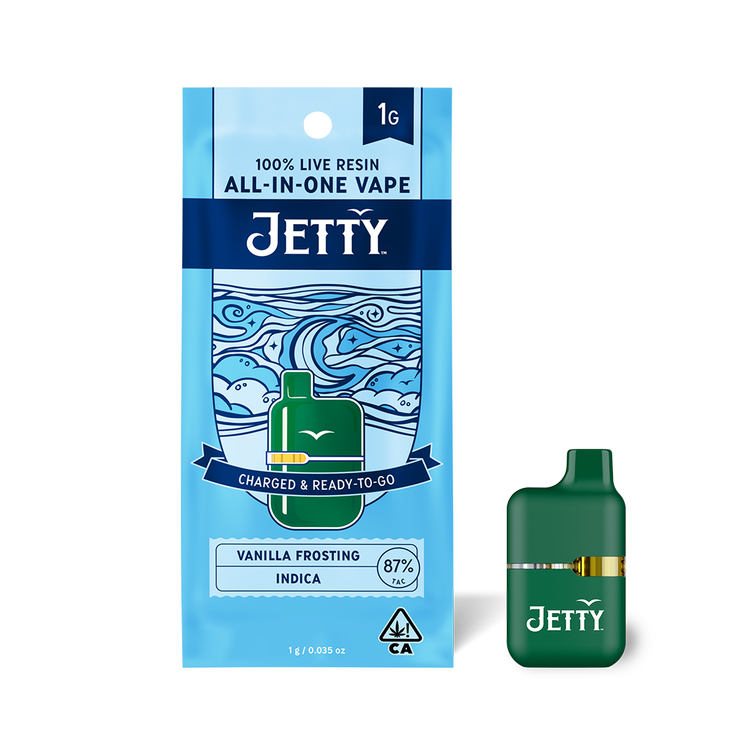 From the Gelato lineage, Vanilla Frosting is sweet with vanilla and fuel notes. We enjoy this Indica for its high terpene content; this badder clocks in at 12.5%! Strong, tasty, and a great after-dinner treat. "Jetty 100% Live Resin has a whole new look. We’ve improved oil clarity, boosted the potency, and sharpened the flavor for a whole new experience. We removed the fats and waxes that clog your vape, ensuring a smooth smoke from start to finish. With our specialized purification processes, every puff delivers the true essence of the plant, offering a pure and bold flavor that stays great all the way to the end of your cart. Jetty Extracts invites you to explore, rise, and TAKE FLIGHT with our expertly crafted 100% Live Resin. Now ECCO Certified. Pure, potent, and portable, Jetty’s All-in-One Vape delivers everything you want in a vape. CCell's industry-leading Mini Tank hardware features EVOMax ceramic heating. Charged and ready to enjoy, it is designed to go wherever you do. "