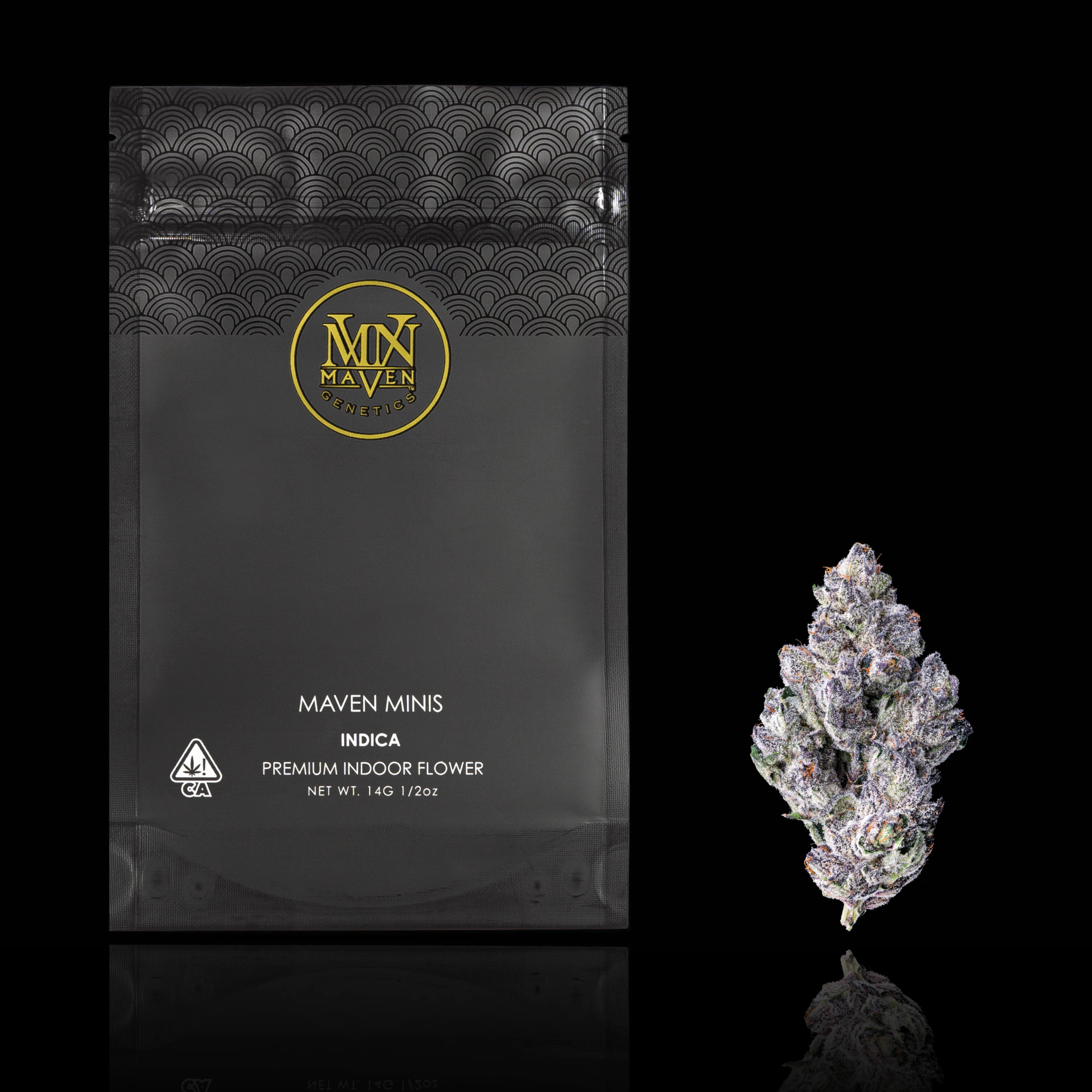 A powerful fusion of heritage and edge, 98 Karat is the pinnacle of our Gold Indica Standard. A heavy-hitting cross of our famous Black Diamond X and 98 Reserve, this richly layered cultivar blends classic Kush strength with an expressive and bold terpene profile. Its buds are a visual standout—lavender-toned with flashes of lime green and burnt orange, sealed in a glistening armor of resin-rich trichomes. The nose opens with a candied citrus glaze, followed by sharp lemon zest and cooling waves of eucalyptus. As it settles, champagne effervescence and earthy funk emerge, adding depth and intrigue. The high delivers immediate clarity—an uplifting, cerebral rush that melts into a full-body calm. Potent without being sedative, it makes space for conversation, creativity, and presence. Intentional, layered, and bred for complexity, 98 Karat is a modern Kush evolution—a crown jewel in our latest lineup. Whether you are an experienced connoisseur or a novice, Maven Minis offer the perfect balance of quantity and quality, delivering the same high-caliber experience as our full-sized flower, but in a convenient and travel-friendly package. These compact 14g Mylars may contain smaller nugs - but don't be fooled by their size! Each bag is packed with the same nuanced, top-tier Maven Genetics strains you know and love.