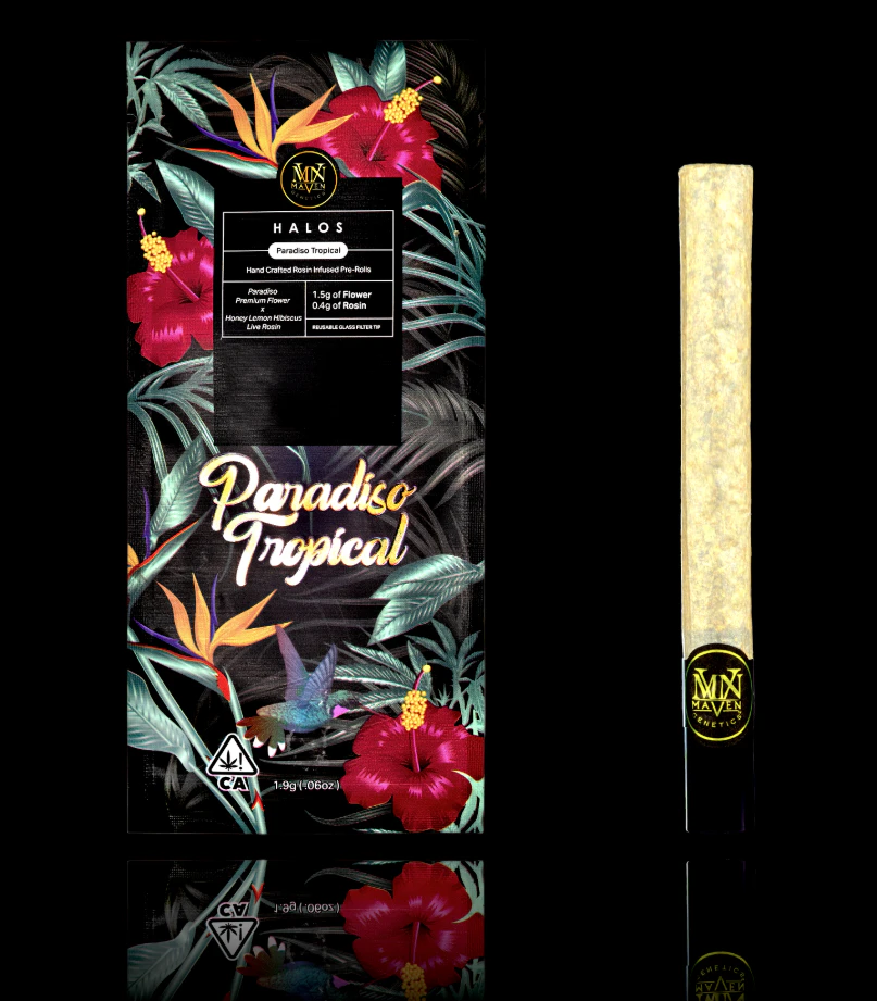 Paradiso Tropical is a dreamy blend of our fragrant, exotic Paradiso flower with our bittersweet, refreshing Honey Lemon Hibiscus Live Rosin. A light floral note greets you upon inhalation, while the slow burn of the concentrate adds layers of fruit and assorted citrus, culminating in an airy, honeyed exhale that evokes the flavors of island life - transporting you on a one-way ticket to tropical paradise. Our Premium Rosin-Infused Halo Pre-Rolls are handcrafted with Top-Tier, Strain-Specific flower and the finest Solventless Concentrate. This curated blend radiates a sophisticated flavor profile - an aura of the highest caliber.