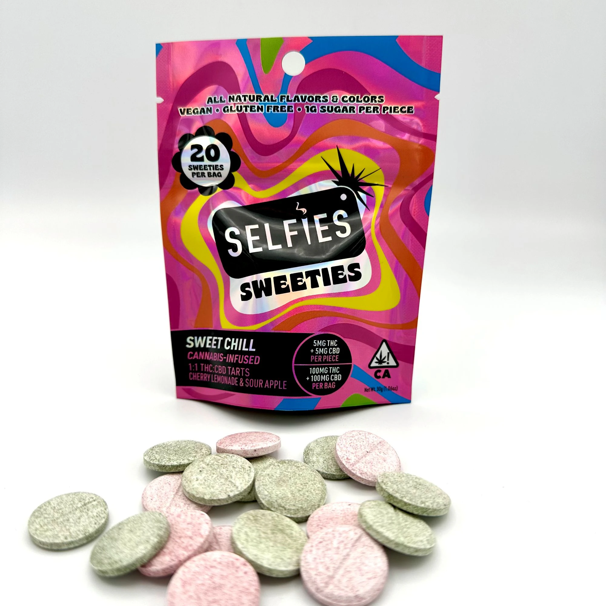 20ct tarts per bag | 1:1 THC:CBD 5mg THC/5mg CBD per piece | 100mg THC/100mg CBD per bag. Infused tarts with all-natural flavors and colors. Vegan, gluten-free, and only 1g sugar per piece. Sweet Chill infused tarts are just what you need to vibe. Cherry Lemonade & Sour Apple flavors.
