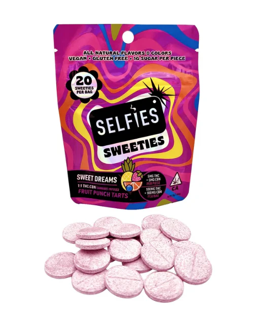 20ct tarts per bag | 1:1 THC:CBN 5mg THC/5mg CBN per piece | 100mg THC/100mg CBN per bag. Infused tarts with all-natural flavors and colors. Vegan, gluten-free, and only 1g sugar per piece. Sweet Dreams infused tarts are just what you need to relax. Fruit Punch flavors.