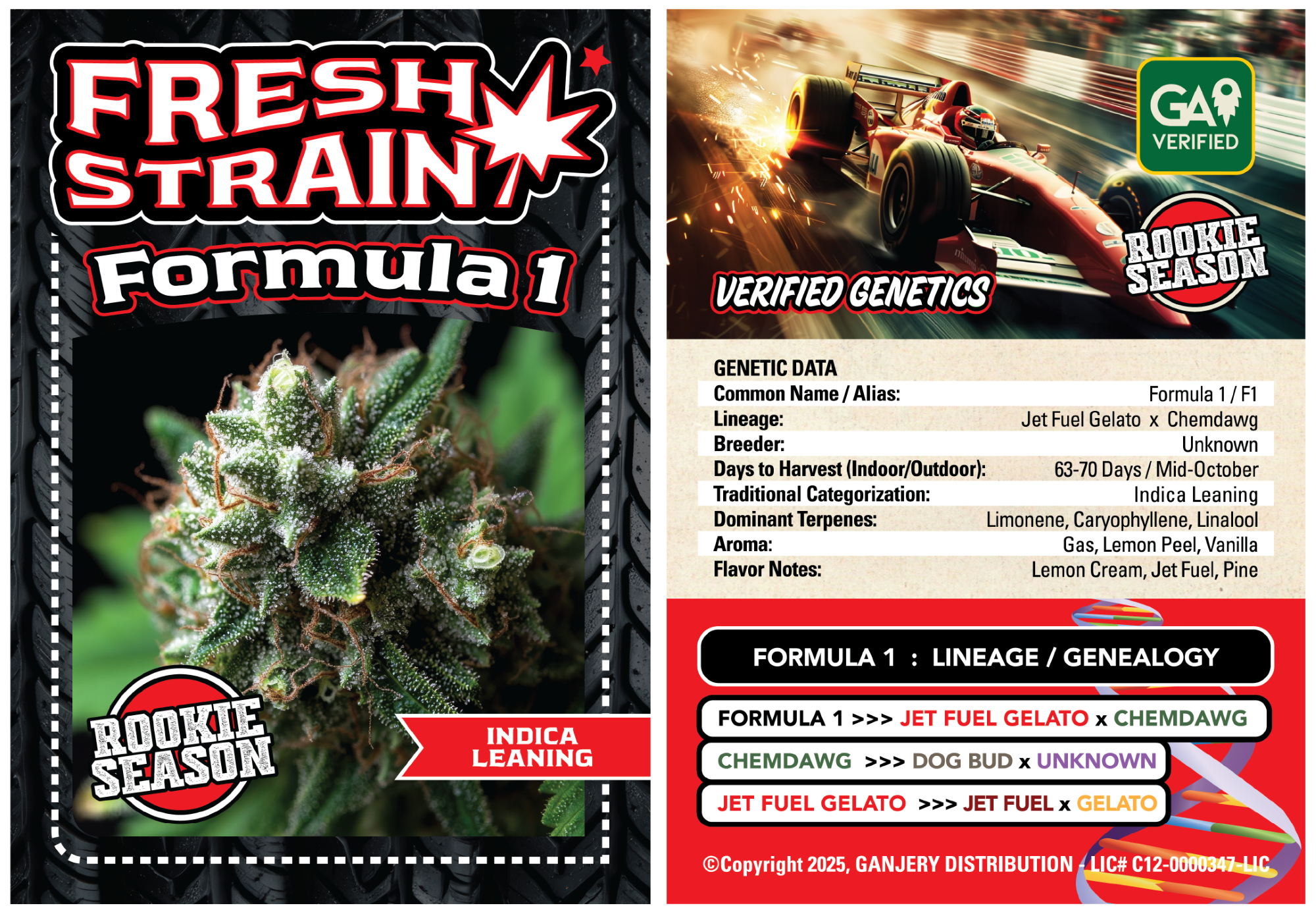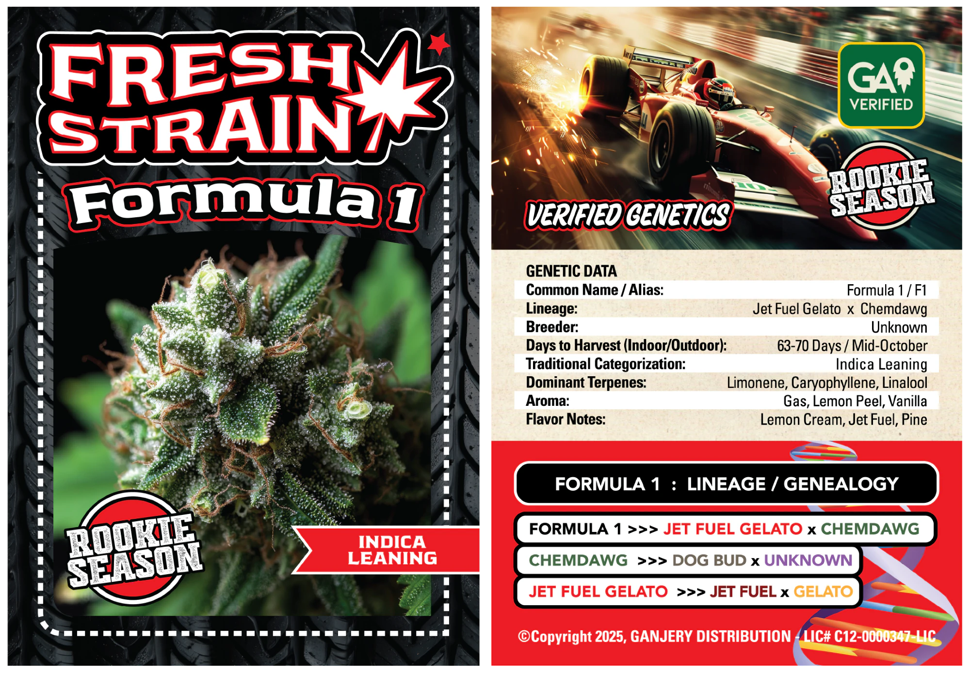Verified Genetics sourced from the Tastemakers and Breeders who pioneered the Top Shelf in California Cannabis. Strain Info: Formula 1 = Jet Fuel x ChemDawg
