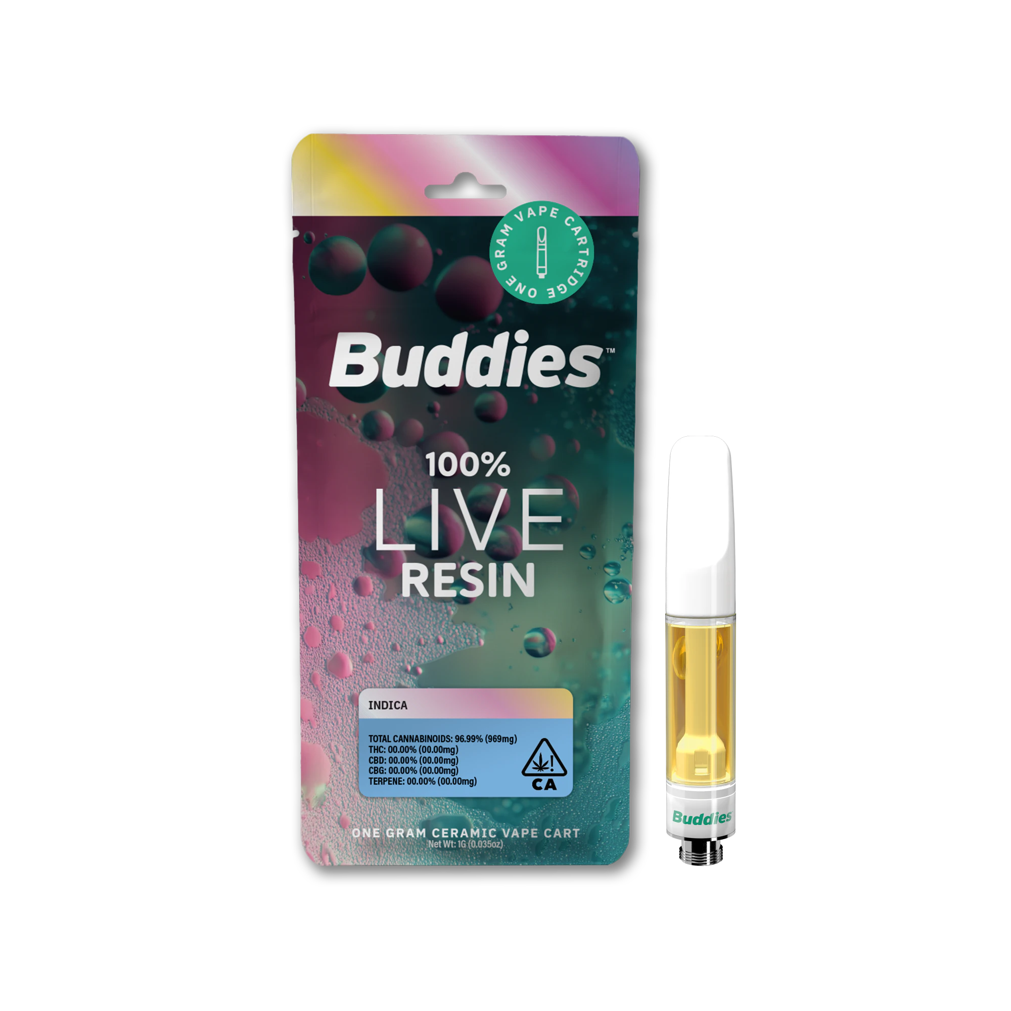 LIQUID LIVE RESIN 1G 510 VAPE CARTS Buddies 100% Liquid Live Resin begins with fresh frozen, whole-plant inputs and no distillate or cutting agents. Our liquifying process allows us to offer our pure Live Resin in a universal 510 thread ceramic vape cartridge for maximum versatility and fantastic flavors every time. Enjoy the same full spectrum experience of our Live Resin dabs while on the go! Zero Distillate | No Additives | No CRC Ingredients: 100% Live Resin