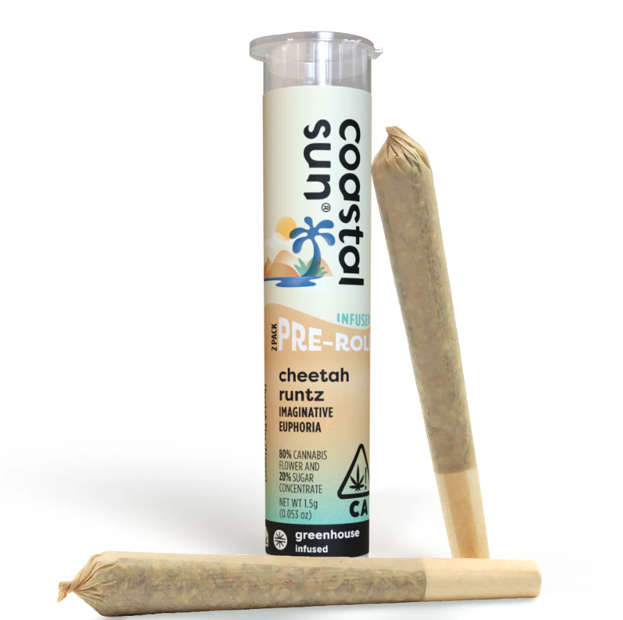 Cheetah Runtz is a mix of 80% Ridgelline Runtz flower and 20% Cheetah Piss sugar concentrate. The package includes two .75g pre-rolls, infused on the inside, with a sweet, gassy, and skunky flavor profile. It has been described as a euphoric experience that can potentially lead to relaxation, happiness, and a boost in creativity. Strain Combination: 80% Ridgeline Runtz Flower x 20% Cheetah Piss Concentrate Extracted By: Euphoric Life Type: Hybrid