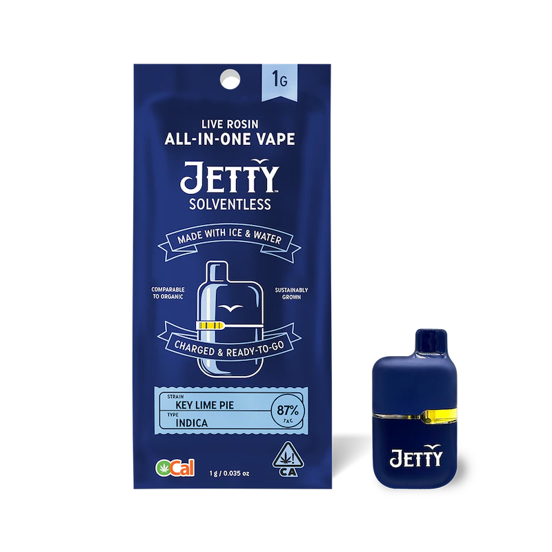 A slice of happiness with a side of chill, Key Lime Pie brings bold lime zest, a dash of spice, and a rich smoothness that lingers. Expect giggles, good vibes, and the ultimate “let’s get comfy” kind of high. "Jetty Solventless is America's #1 live rosin. It is the cleanest oil available, made from OCal certified bud and extracted using only ice and water. Our unique filtration process removes excess fats and waxes increasing purity (and THC %) while keeping all the tasty terpenes. The result: a light, golden oil, and unmatched flavor profile. OCal is the comparable-to-organic program for cannabis grown and manufactured in California. OCal products are cultivated and extracted without pesticides, synthetic fertilizers, or bioengineering. Pure, potent, and portable, Jetty’s All-in-One Vape delivers everything you want in a vape. Award-winning rosin, 85%+ THC, and CCell's industry-leading vape technology. Featuring anti-clogging technology and a ceramic core for a smooth smoke from start to finish.