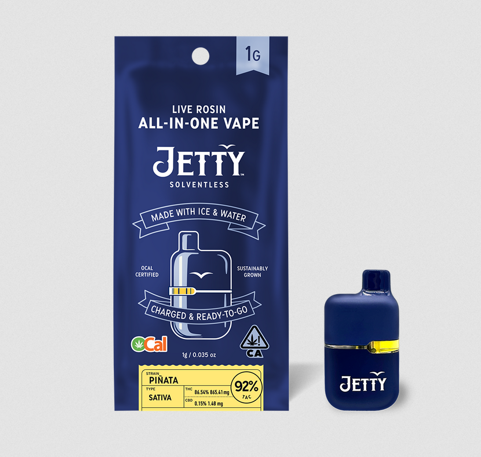 "Piñata is a sativa-dominant strain that promises a euphoric and uplifting experience. With each inhale, you'll be greeted by a burst of sweetness reminiscent of fresh citrus, accompanied by notes of creamy goodness. On the exhale, there's a subtle hint of herbal spice. Whether you're seeking creative inspiration or simply looking to enhance your mood, Piñata is your go-to choice! Jetty Solventless is America's #1 live rosin. It is the cleanest oil available, made from OCal certified bud and extracted using only ice and water. Our unique filtration process removes excess fats and waxes increasing purity (and THC %) while keeping all the tasty terpenes. The result: a light, golden oil, and unmatched flavor profile. OCal is the comparable-to-organic program for cannabis grown and manufactured in California. OCal products are cultivated and extracted without pesticides, synthetic fertilizers, or bioengineering. Pure, potent, and portable, Jetty’s All-in-One Vape delivers everything you want in a vape. Award-winning rosin, 85%+ THC, and CCell's industry-leading vape technology. Featuring anti-clogging technology and a ceramic core for a smooth smoke from start to finish. "
