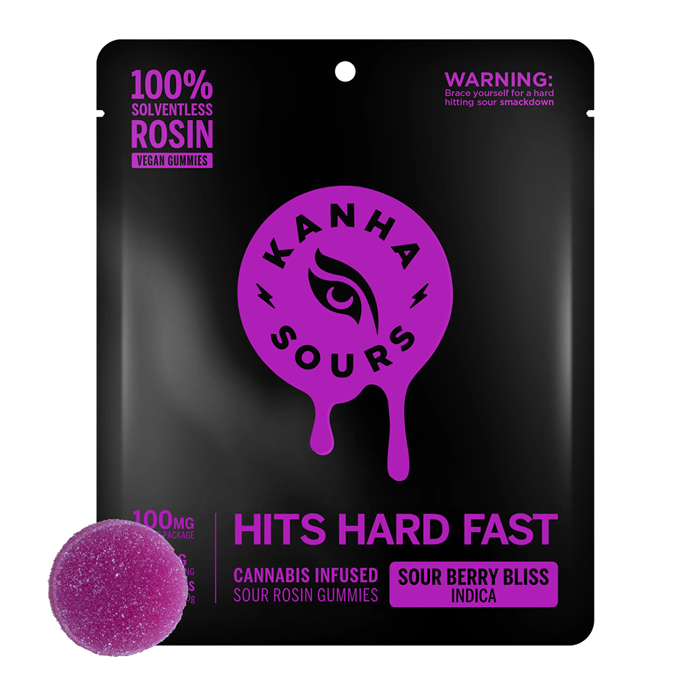 KANHA Sour Berry Bliss -- *10 pieces x 10mg/gummy = 100mg/bag* -- Berry sourness that chills you out. Sour Berry Bliss vegan gummies contain 10mg of fast-acting THC per piece, featuring solventless rosin from Mendo Breath indica strain. With 100mg THC per pack, these gummies will smack you into chill mode. -- 100% Solventless Rosin Vegan Fast-Acting NANO Strain-Specific Hits like flower